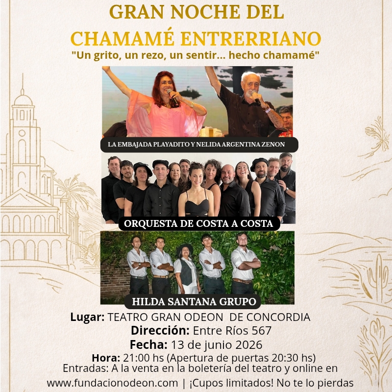 En el marco de un junio cargado de identidad y fe, la ciudad de Concordia se prepara para vivir una noche histórica en el emblemático Cine Teatro Odeón. Bajo el título Gran Noche del Chamamé  Entrerriano “Un grito, un rezo, un sentir… hecho chamamé” se llevará a cabo un espectáculo único que fusionará la devoción popular con la esencia de nuestras raíces musicales.Esta presentación cobra un significado especial al coincidir con dos fechas fundamentales para el sentimiento concordiense y entrerriano