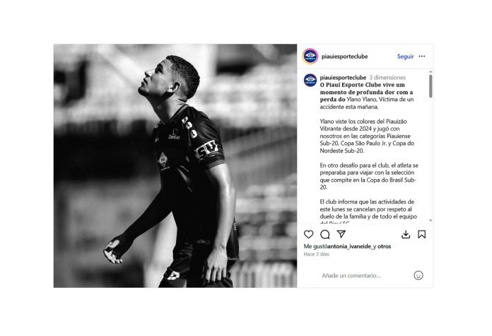En su comunicado, Piauí Esporte Clube expresó: “Piauí Esporte Clube vive un momento de profundo dolor por la pérdida de Ylano, víctima de un accidente esta mañana. Ylano viste los colores del Piauizão desde 2024 y jugó con nosotros en las categorías Piauiense Sub-20, Copa San Pablo Jr. y Copa do Nordeste Sub-20. En otro desafío para el club, el atleta se preparaba para viajar con la selección que compite en la Copa do Brasil Sub-20. El club informa que las actividades de este lunes se cancelan por respeto al duelo de la familia y de todo el equipo del Piauí EC.”