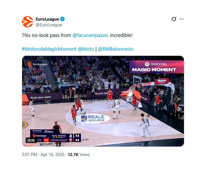 Uno de los momentos más destacados se produjo sobre el final del segundo cuarto, cuando Campazzo sorprendió a todos con una asistencia de espaldas para Mario Hezonja. La acción provocó la exclamación del relator, quien lo definió como “el mágico Campazzo”. La jugada fue seleccionada por la cuenta oficial de la Euroliga como uno de los grandes momentos de la jornada, acompañada del mensaje: “¡Este pase sin mirar de Facundo Campazzo, increíble!”.