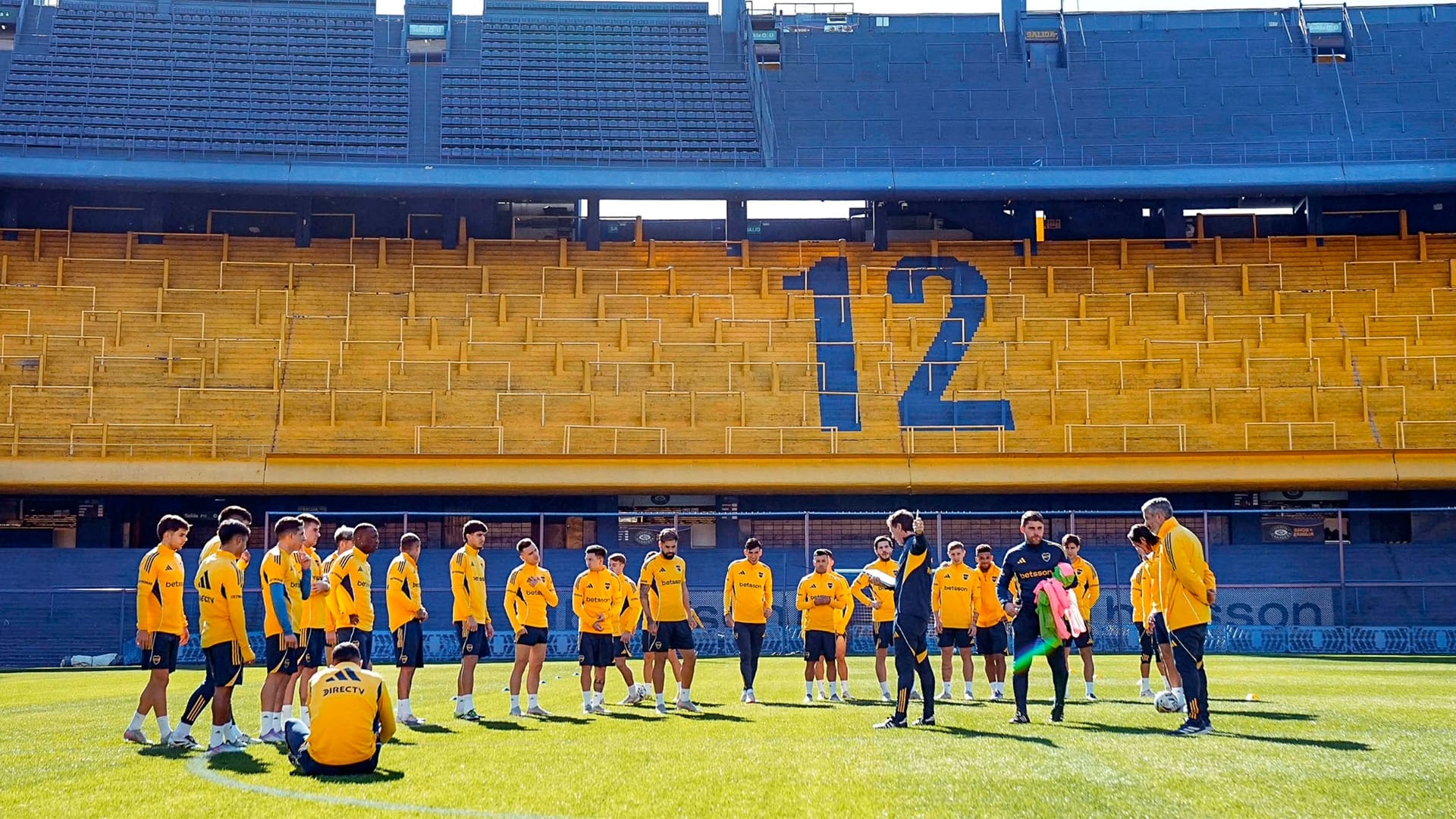 El plantel de Boca durante un entrenamiento en la Bombonera