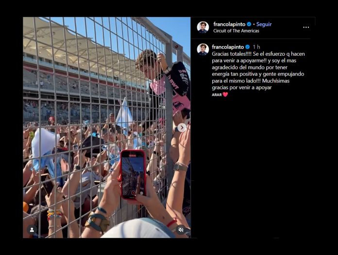 El joven de Pilar publicó en sus redes sociales un mensaje de gratitud: “Gracias totales!!!! Sé el esfuerzo que hacen para venir a apoyarme!! Y soy el más agradecido del mundo por tener energía tan positiva y gente empujando para el mismo lado!!! Muchísimas gracias por venir a apoyar”, expresó Colapinto en su cuenta de Instagram, acompañado por banderas argentinas y emojis de corazón.