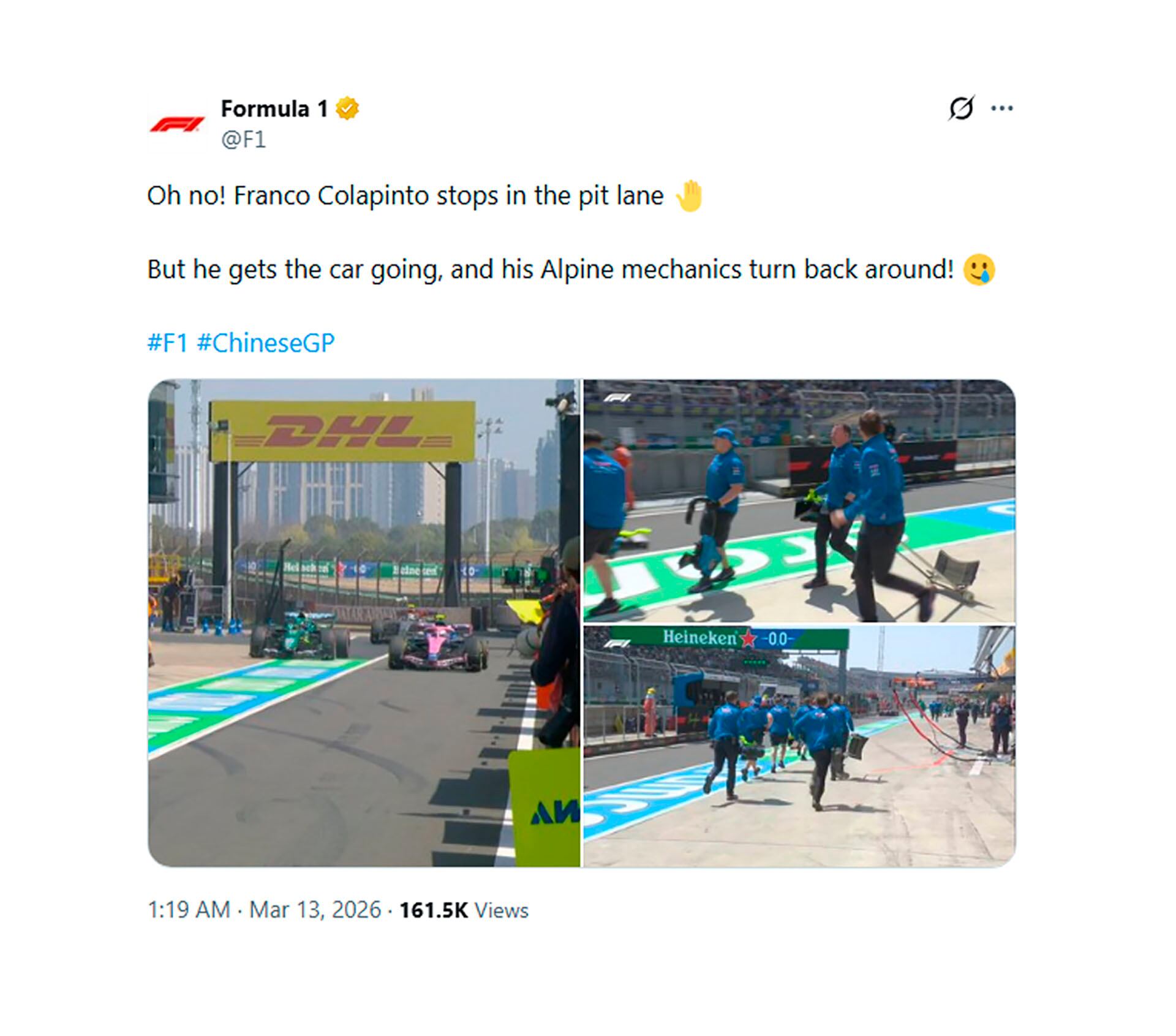 El posteo de la F1 sobre el divertido momento en el que los mecánicos de Alpine corriendo a lo alrgo del pit lane para ayudar a Colapinto (@F1)