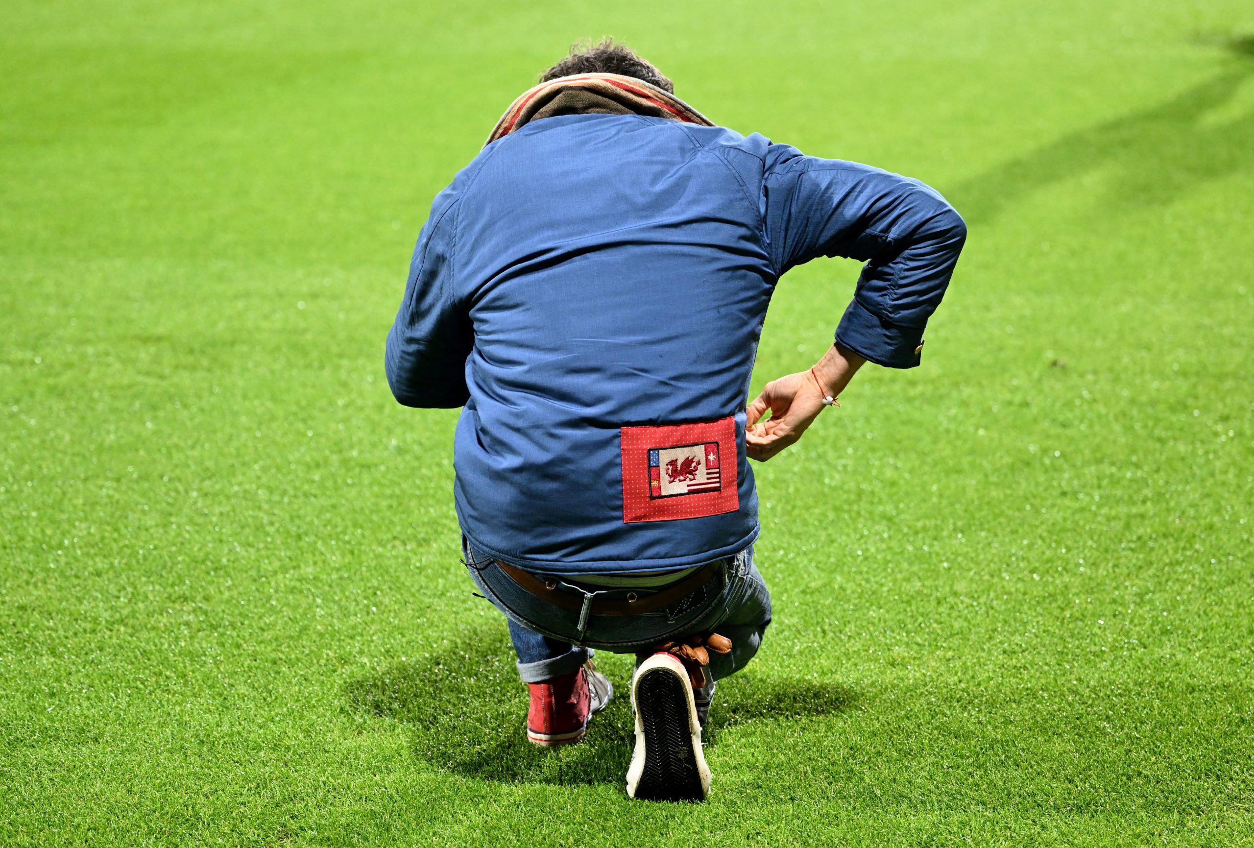 Ryan Reynolds agarrando pasto del estadio antes del inicio del partido como parte de su ritual (REUTERS/Peter Powell)