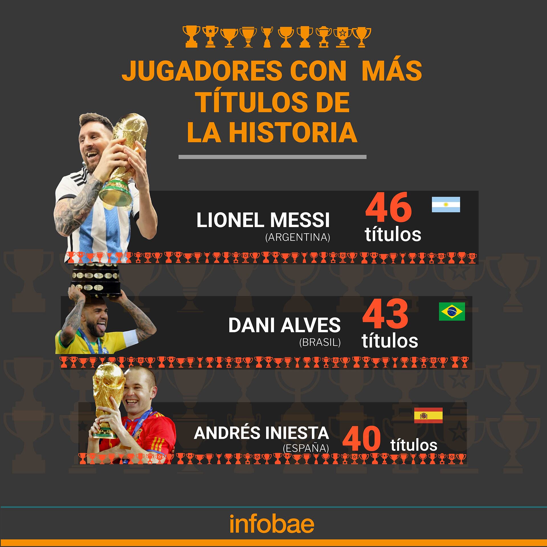 Lionel Messi ostenta 46 títulos en toda su carrera. Con tres menos lo sigue Dani Alves y completa el podio Andrés Iniesta (40)