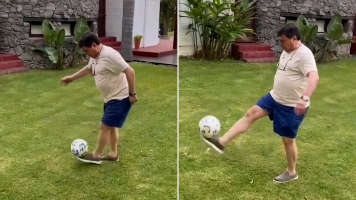 Daniel Passarella hace jueguitos con una pelota de fútbol en su casa (Instagram @danielpassarellaoficial)
