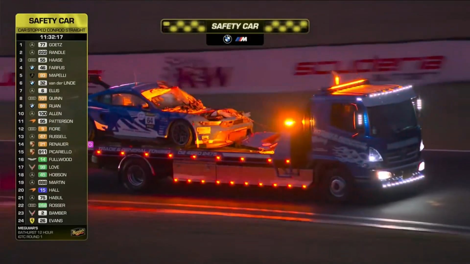 Desde el sitio oficial de la carrera, explicaron: “El Mustang #64 HRT Ford Racing de Mies/Dennis Olsen/Broc Feeney fue retirado en los primeros 20 minutos después de que Mies chocara contra un canguro. Mies, dos veces ganador de las 12 horas de Bathurst, chocó contra el canguro en Conrod Straight en plena oscuridad. El accidente causó ‘daños irreparables’, según un comunicado de Ford Racing. Mies, mientras tanto, se bajó del Mustang GT3 por sus propios medios y regresó al paddock».