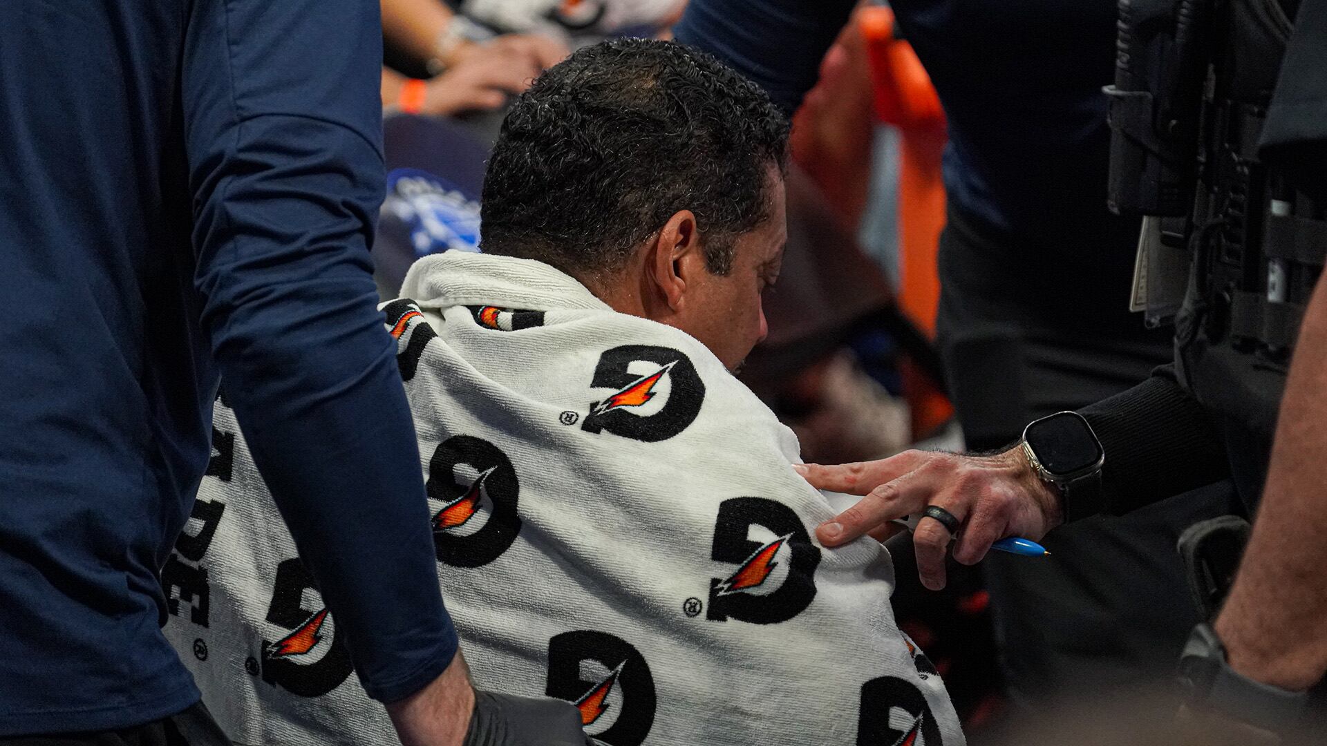 El árbitro Bill Kennedy tuvo que ser retirado en silla de ruedas (Photo by Marty Jean-Louis/Sipa USA)