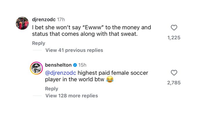 La interacción, lejos de quedar como una anécdota privada, atrajo comentarios de diferentes usuarios. Algunos cuestionaron la reacción de Rodman y otros apelaron a la empatía. Entre las respuestas, un internauta sugirió que la futbolista no tendría reparos ante el dinero y el estatus que acompañan el éxito deportivo: “Apuesto que ella no le dice ‘Puaj’’ al dinero y status que vienen junto al sudor”. Shelton intervino con una réplica tan breve como contundente: “Es la futbolista mejor pagada del mundo, por cierto”, subrayando el estatus profesional de su pareja.