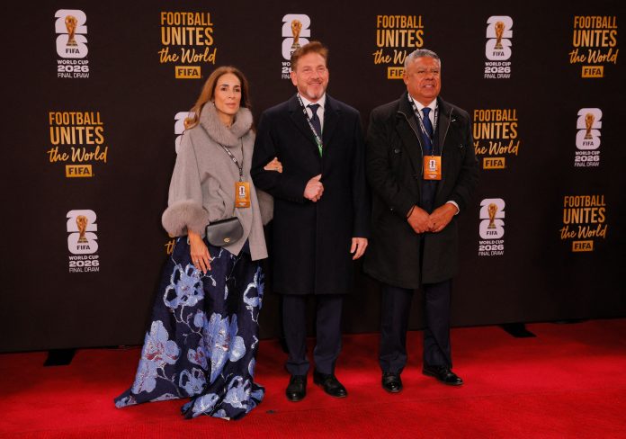 Alejandro Dominguez y su esposa Maria Mercedes Perez, junto a Claudio Tapia (REUTERS/Brian Snyder)