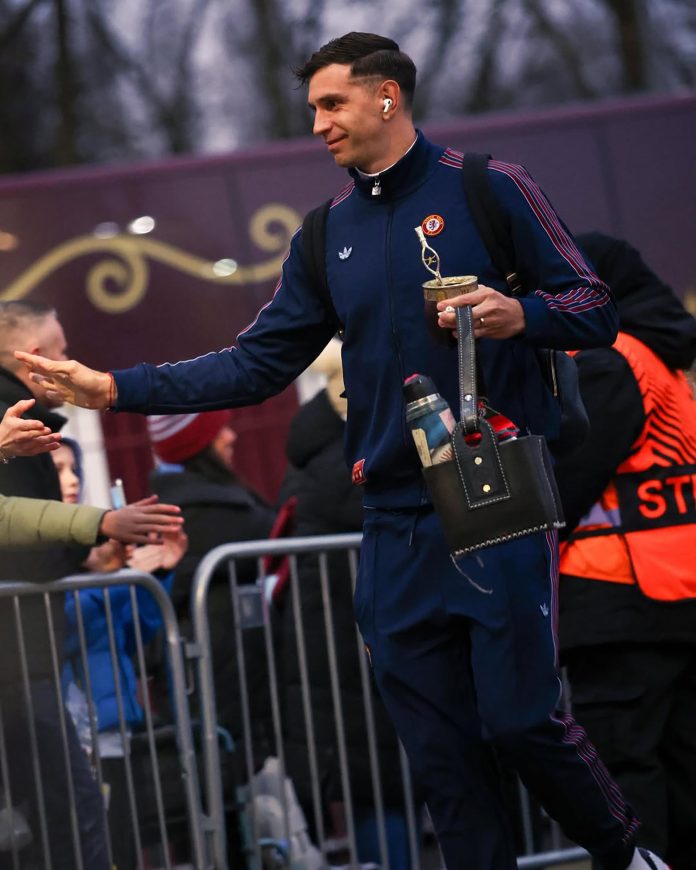El Dibu Martínez luce su singular bombilla en la previa a un partido del Aston Villa
