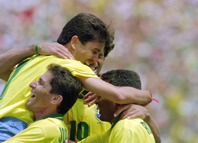 Bebeto celebra con Rai, Romario y Jorginho en el triunfo 3-0 ante Camerún en el Mundial de 1994 (REUTERS/Zoraida Diaz 94178100)