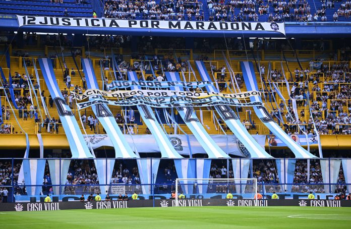 Además de algunas banderas personalizadas con la figura del Pelusa que se ubicaron en las plateas, La 12 dedicó un segmento especial a Maradona con diversas frases. “Justicia por Maradona”, “Gracias Diego por todo tu fútbol” y “Homenaje al mejor jugador del siglo” fueron algunas de ellas. Además, al minuto 10 de partido se gritó “Olé, olé, olé, olé, Diego, Diego”. Y también sonó “Maradóóó, Maradóóó”. El despliegue de banderas durante el recibimiento también incluyó a Lionel Messi y Juan Román Riquelme, con un telón que tenía la frase “campeón del mundo, dos leyendas en un mismo templo”, con la imagen de ambos abrazados compartiendo tiempos como jugadores de la selección.