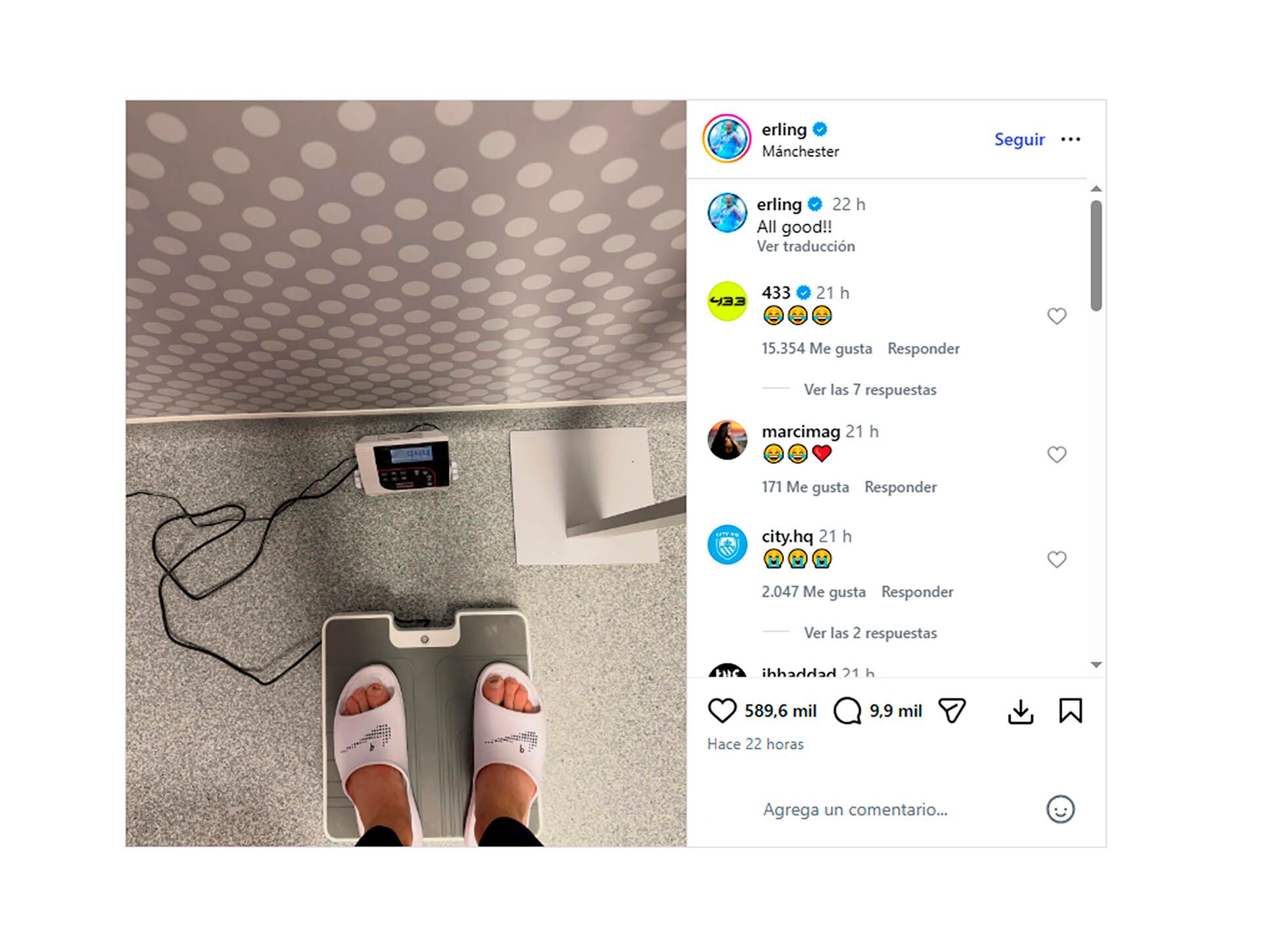 Lejos de escapar al espinoso tema, el goleador Erling Haaland tuvo una pícara respuesta por intermedio de un posteo en sus redes sociales. “¡Todo bien!“, escribió el noruego junto con una foto que colgó a su cuenta de Instagram seguida por casi 40 millones de seguidores donde se veía su punto de vista desde arriba de la balanza, que marcó en ese momento 94.4kg.