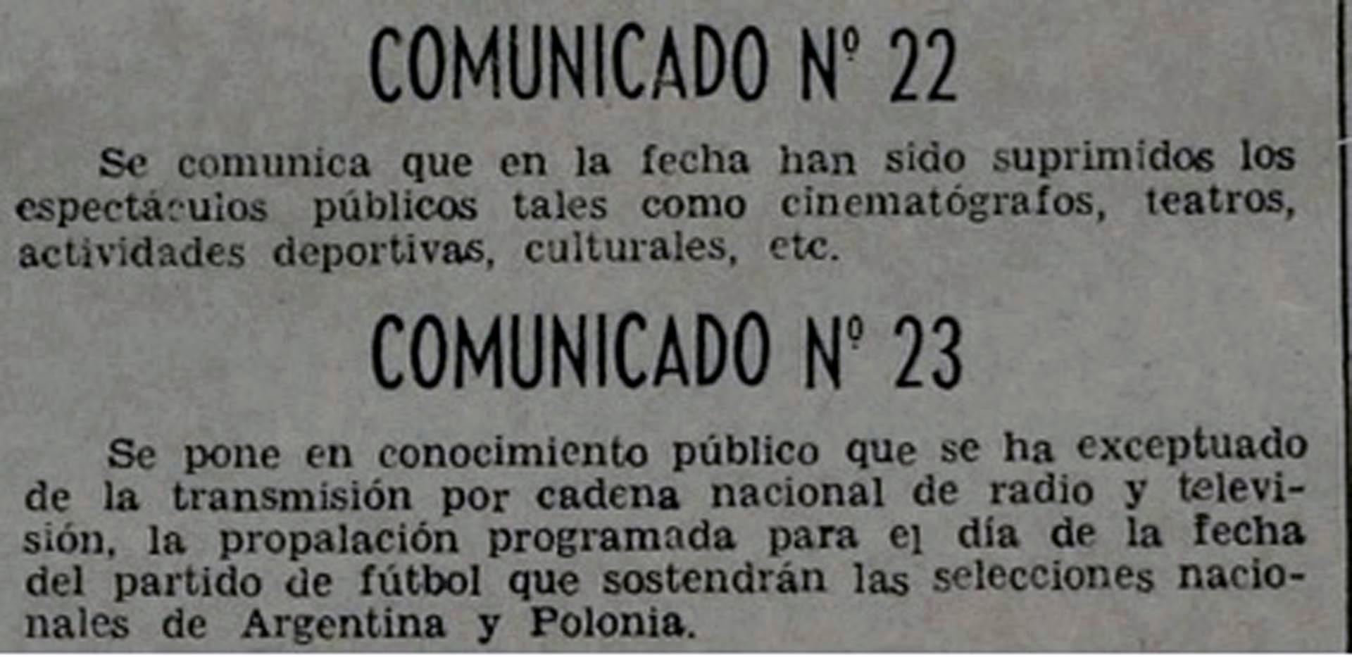 La población ya se encontraba bajo el control de la Junta Militar, como señaló el primer comunicado. Luego fueron llegando más, como el número 22, que anunciaba la suspensión para ese día de los espectáculos públicos, en cines, teatros y actividades deportivas. Y el 23, se refería al fútbol: “Se pone en conocimiento público que se ha exceptuado de la transmisión por cadena nacional de radio y televisión, la propalación programada para el día de la fecha del partido de fútbol que sostendrán las selecciones nacionales de Argentina y Polonia”. Y así fue: las marchas militares y comunicados que inundaban la televisión, se detuvieron a las 13:30 cuando comenzó el encuentro.