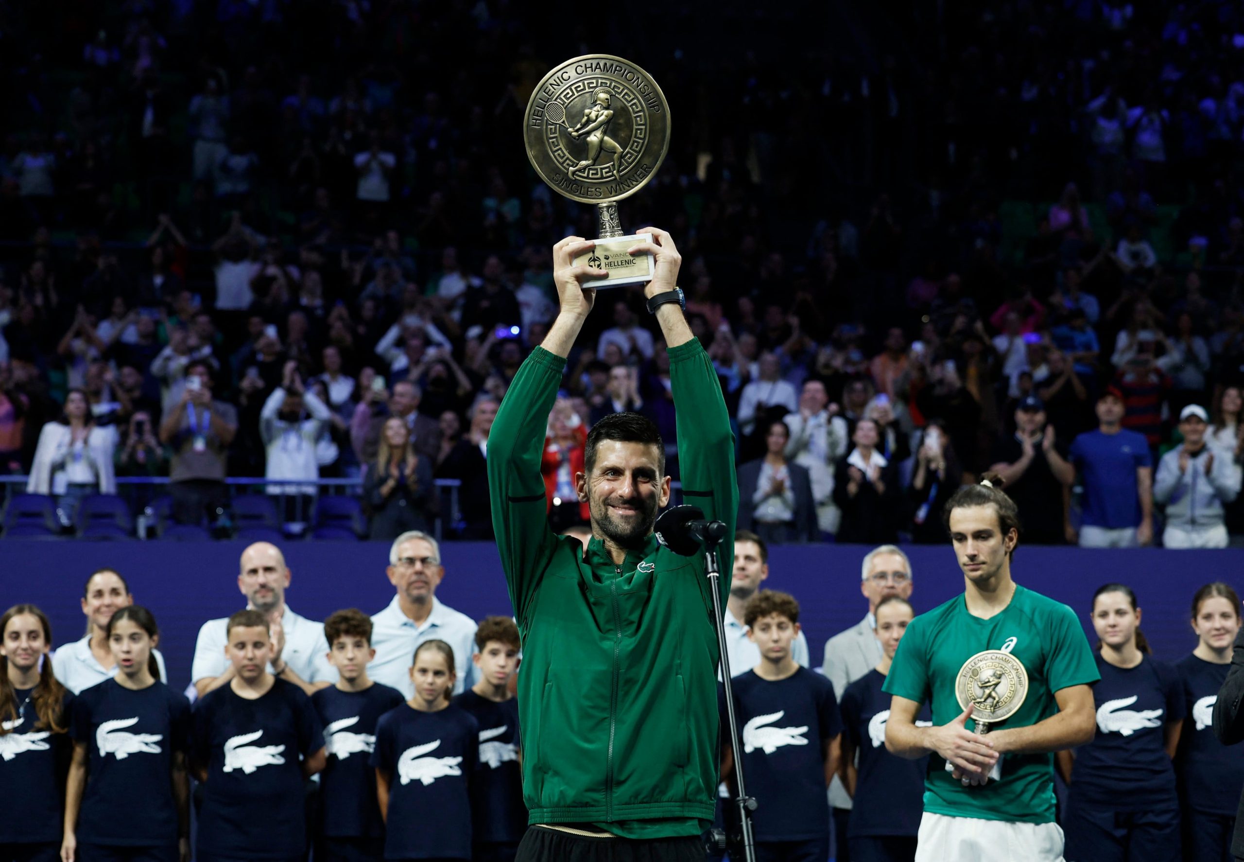Novak Djokovic levanta el trofeo en Grecia. Detrás, Lorenzo Musetti (Fuente: REUTERS/Louiza Vradi)