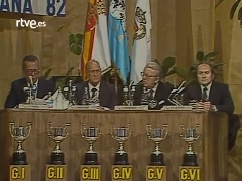 Pablo Porta, Joao Havelange, Hermann Neuberger y Josepp Blatter en la mesa principal del sorteo del Mundial 82