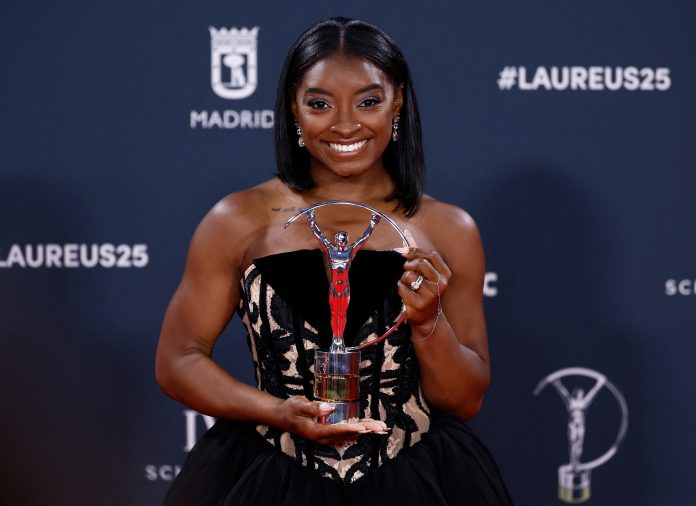 La gimnasta Simone Biles con el premio en la ceremonia de los Laureus 2025 (REUTERS/Juan Medina)