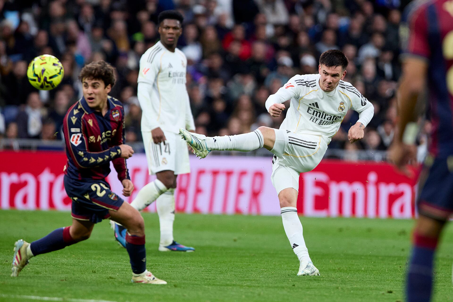 A los 66 minutos, apenas dos minutos después del segundo grito, recibió sobre la banda derecha por parte de Federico Valverde, levantó la cabeza y sacó una pelota perfecta a la espalda de la defensa del Levante: Mbappé ganó el espacio, controló y sacó un derechazo que terminó pegando en el cuerpo del arquero Mathew Ryan, quien achicó bien.